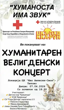 Тетово, 2 април 2026 (МИА) - Волонтерите од Црвен Крст Тетово, дел од Програмата ЦКА-ПХВ (Црвен крст во акција-промоција на хумани вредности), на 7 април организираат хуманитарен концерт насловен „Хуманоста има звук“.