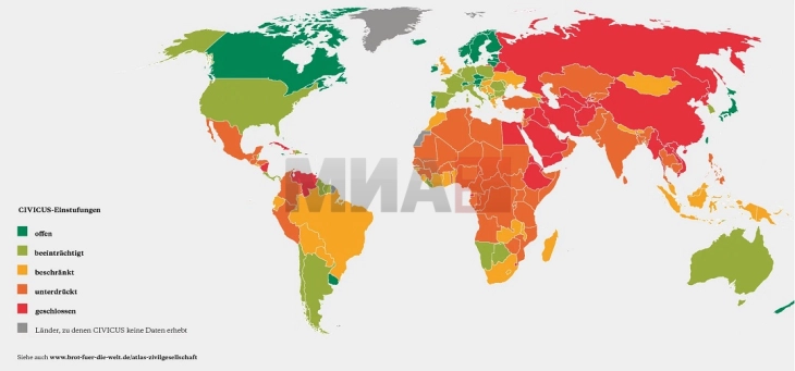 Bruksel, 11 qershor 2025 (MIA) - Vetëm 3.5 për qind e popullsisë së botës jeton në vende ku garantohet liria e plotë e shprehjes dhe tubimit, sipas raportit "Atlasi i Shoqërisë Civile 2025" nga organizata humanitare gjermane luterane "Bukë për të gjithë botën".