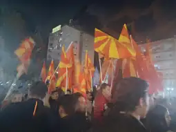 Kumanovë, 2 nëntor 22025 (MIA) - Kryetari aktual i Kumanovës, Maksim Dimitrievski së bashku me bashkëpartiakët nga Lëvizja ZNAM-Për Maqedoninë Tonë dhe partnerët e koalicionit nga VMRO-DPMNE po feston fitoren në sheshin e qytetit në Kumanovë.