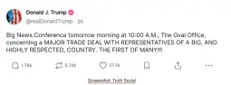 Në një postim në rrjetin e tij social "Truth social" dje ai shkroi se konferenca për mediat në të cilën do të publikohet marrëveshja do të mbahet me "përfaqësues të një vendi të madh dhe shumë të respektueshëm".
