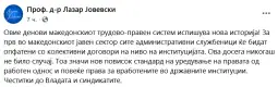 - Këto ditë, sistemi i punës dhe i drejtësisë në Maqedoni po shkruan një histori të re! Për herë të parë në sektorin publik të Maqedonisë, të gjithë punonjësit administrativë do të mbulohen nga marrëveshjet kolektive në nivel institucioni. Kjo nuk ka ndodhur kurrë më parë. Kjo do të thotë një standard i ri më i lartë i rregullimit të të drejtave të punësimit dhe më shumë të drejta për punonjësit në institucionet shtetërore. Urime Qeverisë dhe sindikatave, publikoi në Fejsbuk profesori i së Drejtës së Punës në Fakultetin Juridik në Shkup, Dr. Lazar Jovevski.