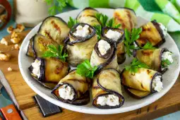 - Një meze ose parangrënie e shijshme, e lehtë dhe tërheqëse nga ana vizuale! Këto role nga patëllxhani i zi janë të mbushura me krem djathi/gjizë, erëza aromatike dhe susam të pjekur, ndërsa të dekoruara me majdanoz të freskët. Janë të përkryera për ditët verore, festa ose si pjesë e një tryeze festive.