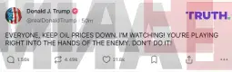 "Të gjithë, mbani çmimet e naftës të ulëta. Ju shikoj! Ju nuk e kuptoni se kjo që po bëni është në dobi të armikut. Mos e bëni", shënoi Trampi në rrjetin Truth Social.