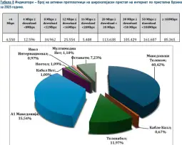 - Интернет со широк опсег лани користеле 549.109 претплатници, што е зголемување за 2,02 проценти за една година. Широкопојасен пристап на интернет по пристапна брзина до и од 100Mbp имале 85.365 претплатници, кај 161.607 брзината била од 50 Mbps до 100Mbps, кај 105.429 од 30 Mbps до 50 Mbps, 113.638 од 20 Mbps до 30 Mbps, 5.408 од 16 Mbps до 20 Mbps, 25.554 од 12 Mbps до 16 Mbps, 34.962 од 8 Mbps до 12 Mbps, 12.596 од 4 Mbps, а 4.550 под 4 Mbps.