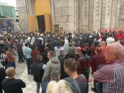 Believers also gathered outside the church, where two large video screens were set up. The ceremony was also being filmed using drone footage.