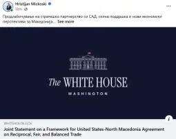 - The White House’s release of the joint statement on reciprocal trade between the U.S. and Macedonia represents a clear signal of deepening strategic partnership and underscores the strong support Macedonia receives from the United States, Prime Minister Hristijan Mickoski said.