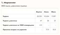 - According to State Statistical Office data, there were 20,201 deaths in the country in 2024, which is an increase of 0.1% compared with the previous year. The structure by sex shows higher male participation, 10,604 men or 52.5% and 9,597 women or 47.5%.