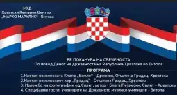 - Хрватски културен центар „Марко Марулиќ“-Битола со целовечерен концерт на далматински музика ќе го одбележи денот на државноста на Република Хрватска. Во пресрет на вечерашната свеченост, портпаролот на ХКЦ „Марко Марулиќ“-Битола, Неда Маретиќ најави дека во битолскиот Офицерски дом ќе настапат далматинската женска клапа „Виоле“ од Дрвеник и женскиот хор „Градац“ од Општина Градац.