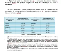 - Во Регистарот на цени и закупнини, во периодот од октомври до декември 2025 година, на целата територија на државава регистрирани се 1.004 новоизградени станови, односно станови од инвеститор, што е за 159 станови повеќе од третиот квартал во 2025 година. Исто така, во Агенцијата за катастар на недвижности досега се запишани 27.522 листови за предбележување градба што укажува дека овие објекти се во фаза на градба и наскоро ќе се најдат на пазарот на недвижности.