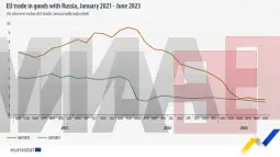 Според сезонски прилагодените податоци на Евростат, уделот на Русија во увозот во ЕУ се намали од 9,6 отсто во февруари 2022 на 1,7 проценти во јуни годинава. Од друга страна, рускиот удел во извозот на ЕУ опаднал од 3,8 проценти лани во февруари на 1,4 отсто во јуни 2023 година.