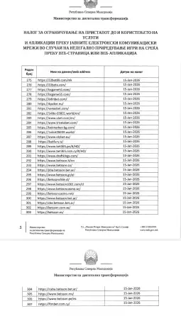 - Со најновиот налог се опфатени дополнителни 33 нелегални веб-страници, што значи дека вкупниот број на досега опфатени (забранети) нелегални страници изнесува 307, се наведува во соопштението од Министерството за дигитална трансформација.