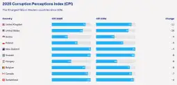 - Индексот се објавува веќе 31 година и рангира повеќе од 180 земји и територии според перцепираното ниво на корупција во јавниот сектор. Ова најново покажува и падови во земји како што се САД, Канада, Велика Британија и Шведска. Индексот за 2025 година покажува драматично намалување на бројот на земји што постигнале повеќе од 80 поени - нивото што укажува дека јавната администрација на една земја е чиста. Пред десет години имаше 12 такви земји, а оваа година само пет.