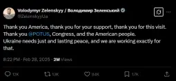 -Благодарам Америка, благодарам за вашата поддршка, благодарам на оваа посета. Благодарам на претседателот на САД, Конгресот и американскиот народ, напиша украинскиот претседател Володимир Зеленски на „Х“ откако ја напушти Белата куќа по расправијата со американскиот претседател Доналд Трамп.