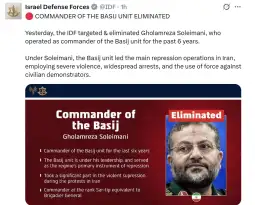 Во меѓувреме, ИДФ соопшти дека во друг напад е убиен и командантот на паравоените сили Басиџ, Голамреза Солејмани.
