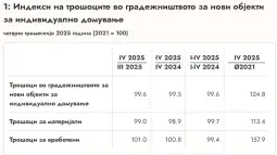 Според ДЗС, трошоците во градежништвото за нови објекти за индивидуално домување, од 1. до 4. квартал во 2025, во однос на истиот период од 2024 година, намалени се за 0,4 проценти, трошоците за материјали за 0,3 проценти, а трошоците за вработените за 0,6 проценти.