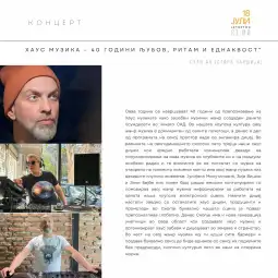 -Во нашата клупска култура, овој жанр на музика е доминантен од самите почетоци, а денес е дел од програмата на секој простор каде се ангажира диџеј. Тројца наши хаус диџеи, кои вредно работеле изминативе декади на популаризирање на оваа музика во клубовите, но и на медиуми, особено на радио и ТВ-емисиите, ќе нè потсетат со забава на отворено на големото значење кое го има овој жанр музика низ декадите клупско живеење, соопшти „Скопско лето“. хс/са/