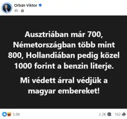 „Европската комисија и германскиот канцелар ги одржуваат санкциите наметнати врз руската нафта. Последиците се тука: во Австрија бензинот чини 700 форинти (100 форинти – 25 евроценти), во Германија 800, а во Холандија речиси 1.000 форинти за литар“, наведе Орбан.