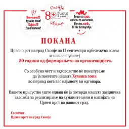 - Црвениот крст на Град Скопје годинава одбележува 80 години од формирањето на организацијата. Централното одбележување на јубилејот е денеска во Градскиот парк Скопје, на плочникот кај фонтаната Лотoс. На мали куќарки т.н. хумана зона ќе бидат прикажани сите активности и социјални сервиси, придружна опрема и показни елементи преку кои граѓаните ќе имаат можност да се запознаат со активностите на организацијата, но и да се информираат што сè нуди во насока на помош и поддршка на сите граѓани.