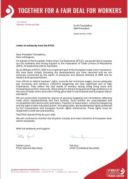 - Особено сме загрижени од пријавите и извештаите за лично таргетирање и заплашување што несомнено има за цел влијание врз претставниците на синдикатите и нивните семејства. Ваквите дејствија се апсолутно неприфатливи и некомпатибилни со демократските принципи. Слободата на здружување, колективното договарање и правото на преземање синдикална акција, активности и чекори, вклучително и штрајк, се фундаментални права заштитени со Конвенциите на МОТ и Европските инструменти за човекови права. Овие права мора да се почитуваат и во Законите и во праксата. Европската конфедерација на синдикати (ETUC) цврсто стои на ваша страна. Ќе продолжиме внимателно да ја следиме ситуацијата и каде што е потребно да изразуваме загриженост на Европско ниво, стои во писмото од Европската конфедерација на синдикати. бак/вг/