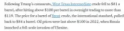 Вашингтон, 10 март 2026, (МИА) - Според последните податоци на CNBC цената на WTI суровата нафта падна на 81 долар за барел, додека Brent суровата нафта се спушти на 84 долари за барел.