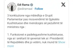 Преку објава на Икс информираше за три заклучоци од состанокот по, како што стои „неодлучноста на Уставниот суд и повторното воведување на суспензијата на вицепремиерката и министерка за инфраструктура и енергетика, Белинда Балуку“, против која е поднесено обвинение за поврзаност со тендерските постапки за тунелот Логара, дел од проектот за Големата обиколница во Тирана и други капитални објекти.