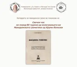 - На Филолошкиот факултет „Блаже Конески“ во Скопје денеска ќе се одржи свечен час по повод 80 години од излегувањето на Македонската граматика од Круме Кепески.