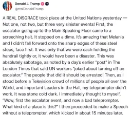 Преку социјалната мрежа Truth Social, тој изјави дека првата саботажа се случила кога влегол во зградата на Обединетите нации кога, токму во тој момент, се случил дефект на елеваторот, поради што тој и неговата придружба морале да се упатат пеш кон главната сала.