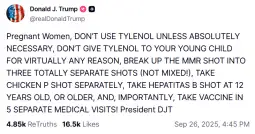 Вашингтон, 26 септември 2025, (МИА) -Бремени жени, не користете „таленол“ освен ако не е апсолутно потребно, не давајте „таленол“ на вашето мало дете туку-така без никаква причина, поделете ја ММР вакцината (против морбили, заразни заушки и рубеола, н.з.) на три посебни вакцини, на три одделни дози (не сите заедно во една вакцина), земете ја вакцината против овчи сипаници одделно, против хепатитис Б после 12 годишна возраст и најважно, примете ги вакцините во пет посебни посети на медицинскиот тим. Претседател Доналд Трамп