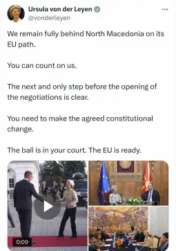 -Вашиот следен и единствен чекор пред отворањето на преговорите е јасен, а тоа е да ги направите уставните измени. Топката е во Вашиот двор. ЕУ е подготвенам напиша кусо Фон дер Лајен.