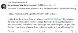 - „Претседателот на САД, Доналд Трамп, нареди акција, а Министерството за војна ја спроведува. Денеска ја објавувам операцијата „Јужно копје“, напиша Хегсет во објава на социјалната мрежа X.