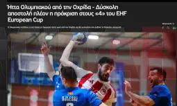 Во текстот под наслов „Црвено-белите во Охрид по пресврт“, од Олимпијакос коментираат дека машкиот ракометен тим „беше поразен со 31:26 од силниот Охрид во преполната сала во Илиуполи“.