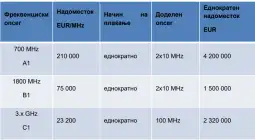 АЕК предлага висината на најнискиот износ на еднократниот надомест да изнесува 4 200 000 евра за одобрението А1 во фрекфенцискиот опсег 700 MHz, 1 500 000 евра за одобрението Б1 за фрекфенцискиот опсег1800 MHz, 2.320.000 за одобрението Ц1 за фреквенцискиот опсег 3400-3800 MHz.
