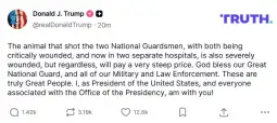 Трамп рече дека двајца припадници на Националната гарда се „критично ранети“ и додаде дека двајцата се сместени во различни болници. Тој го нарече напаѓачот „животно“ и јасно изјави дека виновникот ќе се соочи со тешки последици. „Тие ќе платат многу висока цена“, рече Трамп.