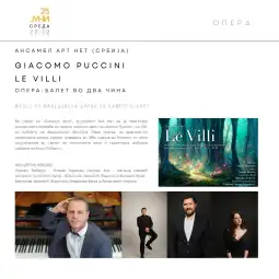 Во однос на концертната изведба на првото сценско дело на Џакомо Пучини - Le Villi, со либрето на Фердинандо Фонтана, станува збор за кратка, но драматично интензивна опера, првпат изведена во 1884 година во Милано, и ги носи слушателите во светот на мистичните вили и трагичната љубовна судбина на Ана и Роберто.