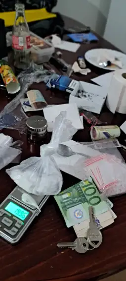 При претресот, откриени и запленети биле најлонски кеси со бела прашкаста материја, односно кокаин со различна грамажа, една дигитална вага со остатоци од прашкастата материја, парични средства - во денари и евра, а затекнато е и лицето Ф.К., на 22-годишна возраст од Скопје, кај кого е пронајдена кесичка со бела прашкаста материја, односно кокаин.