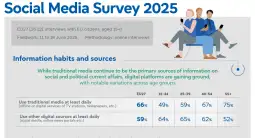 - Традиционални медиуми, како ТВ станици, весници и радио станици се уште се најмногу користени за секојдневно следење содржини за општествено-политички актуелни настани – две третини од граѓаните на ЕУ (66%), иако и другите дигитални извори, како социјални медиуми, видео или платформи за стриминг, блогови, онлајн портали за вести се изеденачуваат и рекле дека ги користат 59 проценти од испитаниците, покажува Евробарометарот 2025 за користењето на социјалните медиуми во ЕУ.