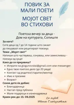 Скопје, 6 сeптември 2025 (МИА) - Писателката Ивана Глоѓуновска објави конкурс за поезија, насловен „Мојот свет во стихови“. Конкурсот е наменет за „сите деца, од 7 до 14 години, кои сакаат да пишуваат или рецитираат“, како што се наведува во повикот.