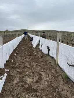 Кавадарци, 8 април 2025 (МИА) - Лозари од неготинското село Курија ги покрија виновите лози за да ги заштитат од пролетни ниски утрински температури, што години наназад предизвикуваат мрзнење на лозјата. Станува збор за семејството Ставрови, кое обработува речиси 40 декари под лозови насади. Во изјава за МИА, браќата Стефан и Дарко појаснија дека одлучиле виновите лози да ги покријат со агрил, што вообичаено го користеле за покривање на раноградинарски култури како зелка, пипер и други, за да се спасат од мрзнење.