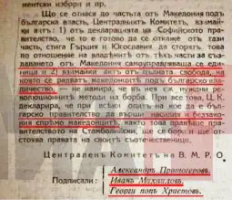 „Зарем ХРСС не беше во договор со Косовскиот комитет и Македонска револуционерна организација. Тоа јасно се гледа од прогласот на бугарските комунисти, кои по убиство на Т. Александров, го објавија во софискиот весник ’Независимост‘, од којшто го пренесуваме следново: Тешката борба што ја водат албанскиот, македонскиот и хрватскиот народ ги зближи тие народи во нивните национално-револуционерни организации - Косовскиот комитет, Македонската револуционерна организација, ХРСС и останатите помали групации. Тие организации долго се договараа за заедничка борба и на крајот се договорија...”