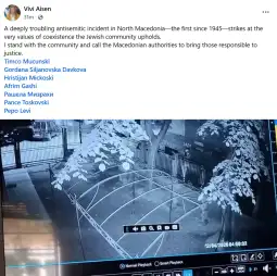 - Длабоко вознемирувачки антисемитски инцидент во Северна Македонија - прв од 1945 година - ги погодува самите вредности на соживот што ги почитува еврејската заедница. Јас сум на страната на заедницата и ги повикувам македонските власти да ги изведат одговорните пред лицето на правдата, наведе амбасадорката Аисен.