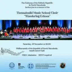 Скопје, 15 ноември 2025 (МИА) - Младинскиот хор од Солун вечер во 18:30 часот,  во малата сала на Филхармонијата во Скопје ќе одржи концерт насловен „Wandering Echoes“.