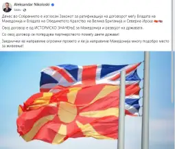 -Изгласан е Законот за ратификација на Договорот меѓу Владата на Македонија и Владата на Обединетото Кралство на Велика Британија и Северна Ирска. Овој Договор е од историско значење за Македонија и развојот на државата, напиша вицепремиерот Николоски на својот фејсбук профил.