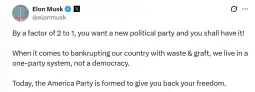 Повикувајќи се на таа анкета во својот пост во саботата, Маск напиша: „Со фактор 2 спрема 1, сакате нова политичка партија и ќе ја имате!“.