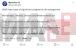 Европската комесарка за проширување Марта Кос рече дека 2026 година ќе биде „момент на вистината за сите земји кандидати“, нагласувајќи дека „обединет континент е најсилниот одговор за оние кои се обидуваат да ја поделат и дестабилизираат Европа“.