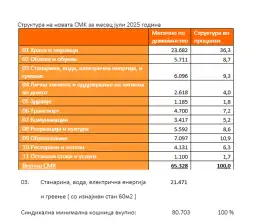 Вредноста на Синдикалната минимална кошница (СМК) за храна и пијалаци, за 63-те производи кои ги следи СМК,  за јули 2025 изнесува 23.682 денари и споредено со јуни 2025 (23 167 денари) е зголемена за   515 денари.