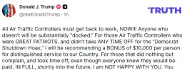 „Сите контролори на летање мора веднаш да се вратат на работа!!! Секој што нема да го стори тоа ќе биде строго казнет. За оние контролори на летање кои беа ГОЛЕМИ ПАТРИОТИ и не зедоа СЛОБОДНИ ДЕНОВИ за време на „измамата за затворање на демократите“, ќе препорачам БОНУС од 10.000 долари по лице за извонредна служба кон нашата земја.