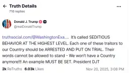 Притоа американскиот претседател се осврна на неколку членови на Конгресот кои претходно служеле во војската или разузнавачката заедница, а кои оваа недела објавија видео на социјалната мрежа X во кое ја повикаа војската и разузнавачката заедница да „ги отфрлат нелегалните наредби“.