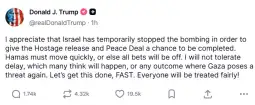 Затоа денеска во својата нова објава на Тruth Social американскиот претседател напиша дека го цени фактот што Израел привремено го запрел бомбардирањето.