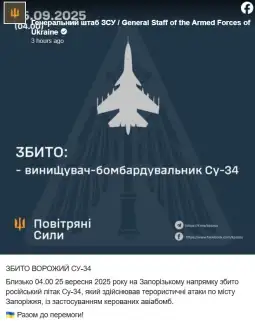 Украинските воздухопловни сили, на Телеграм, соопштија дека го собориле рускиот авион околу 4 часот утринава, додека авионот Су-34 „вршел терористички напад врз градот Запорожје и исфрлал водени бомби“.