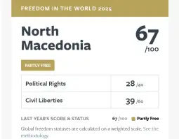 - Македонија и годинава останува делумно слободна земја, покажува последниот извештај на „Фридом хаус“ насловен „Слободата во светот 2025“. Земјава, исто како и минатата година, има индекс на слободата од 67 од можни сто поени.